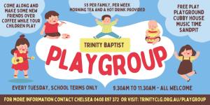 Trinity Baptist runs a weekly playgroup each Tuesday morning from 9:30 to 11.30am (you’re welcome to come and go as you need), during school terms. Come along for a free-play time with toys, crafts, playdough as well as an outdoor playground with cubby house, climbing frame and sandpit. All ages of pre-schoolers welcome from newborn babies, toddlers to kindergarten age children. There is usually a short story and song time too.